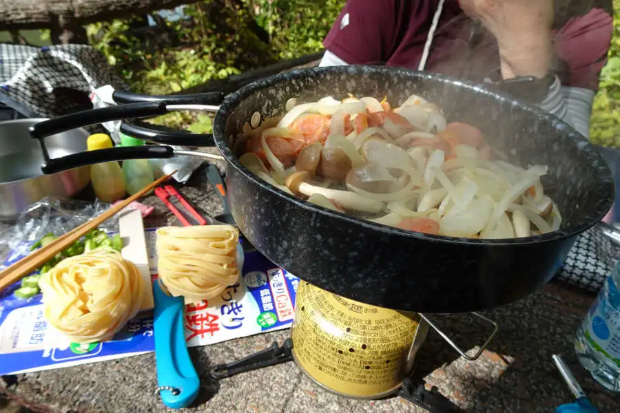 少し早いようですが湖畔のベンチでフィットチーネの昼食です。ハイキング用のフライパン、食材も手軽で軽いハイキングには便利と言うものです。