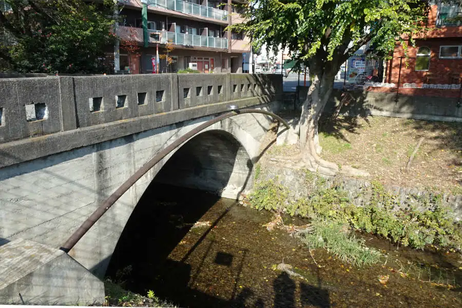 玉川上水の遊歩道は八高線の高架の下を通り拝島駅にたどり着きました。玉川上水には日光橋が架かっています。明治に建築されたレンガ式のアーチ橋で、国内に現存する最古の道路レンガアーチ橋と言います。